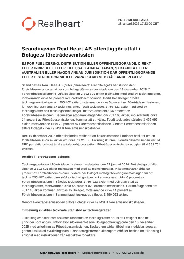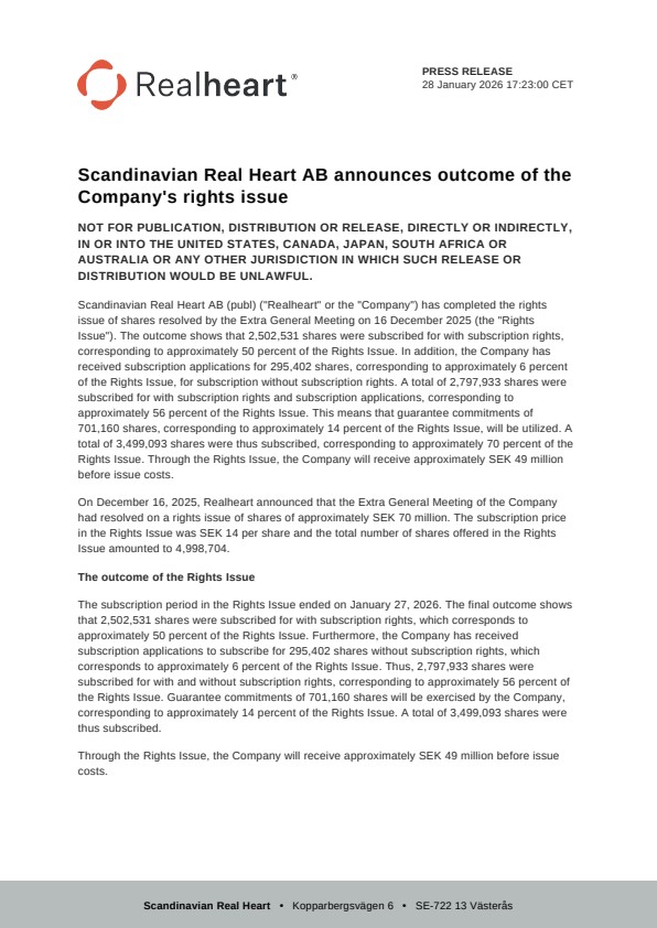 Scandinavian Real Heart AB (publ) ("Realheart" or the "Company") hereby announces an update regarding the directed share issue resolved by the Board of Directors on 27 March 2025 (the "Directed Share Issue"). As previously communicated, the European Investment Council ("EIC") required a certain period to make an investment decision regarding potential participation in the Directed Share Issue in accordance with its regulations and internal processes. EIC has now subscribed for 600,000 shares in the Directed Share Issue. The subscription price in the Directed Share Issue amounts to SEK 11.13 per share. Consequently, the Company will be provided with SEK 6,678,000.