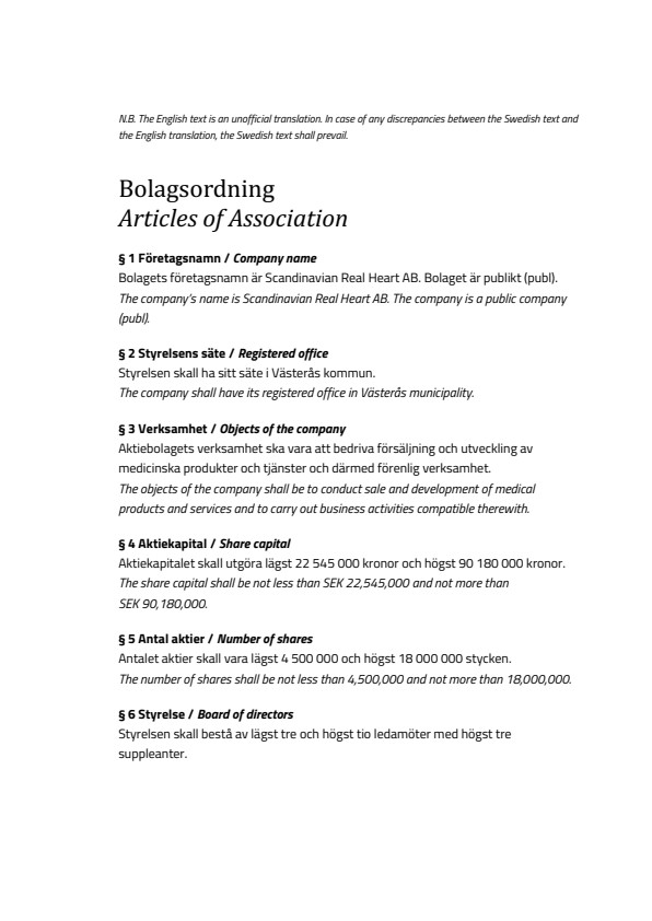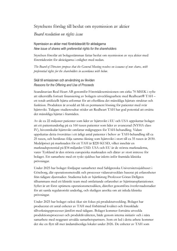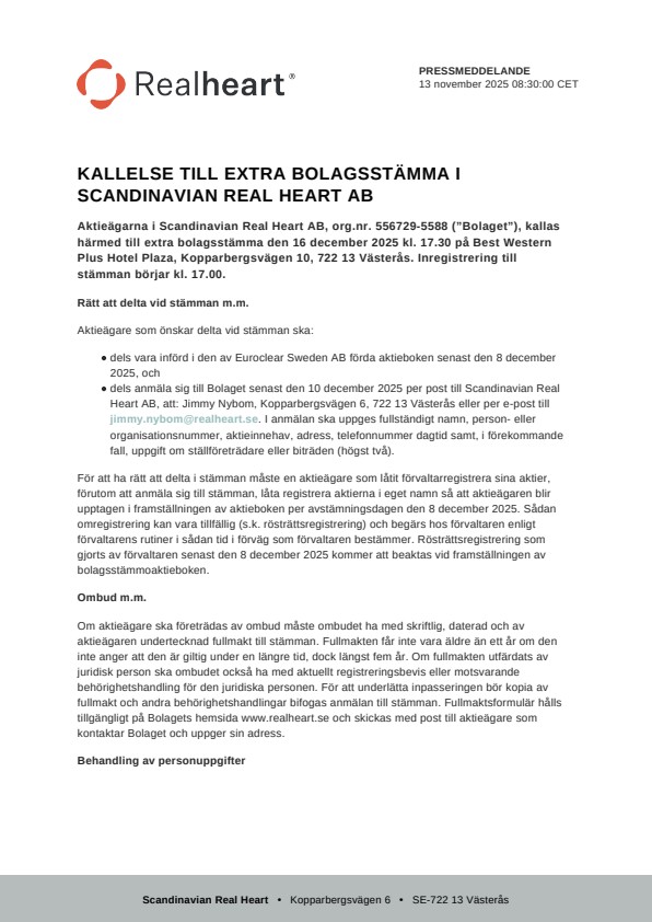 Aktieägarna i Scandinavian Real Heart AB, org.nr. 556729-5588 (”Bolaget”), kallas härmed till extra bolagsstämma den 16 december 2025 kl. 17.30 på Best Western Plus Hotel Plaza, Kopparbergsvägen 10, 722 13 Västerås. Inregistrering till stämman börjar kl. 17.00.
